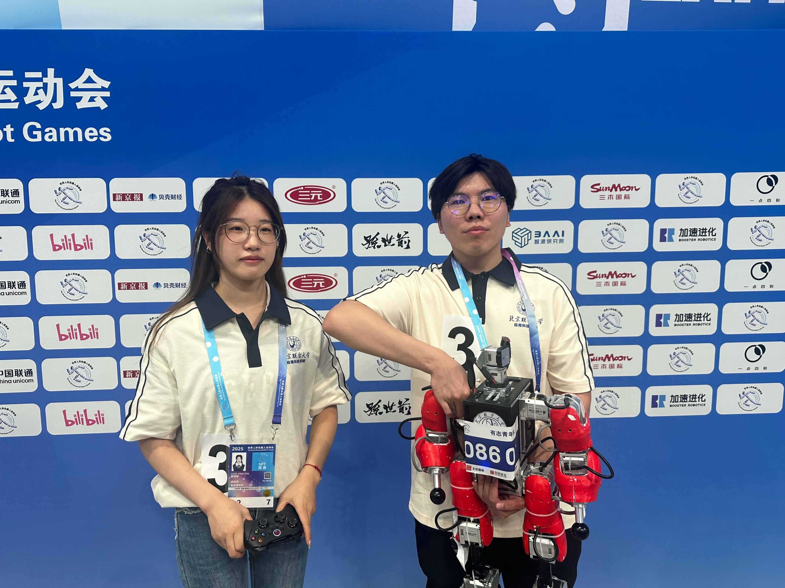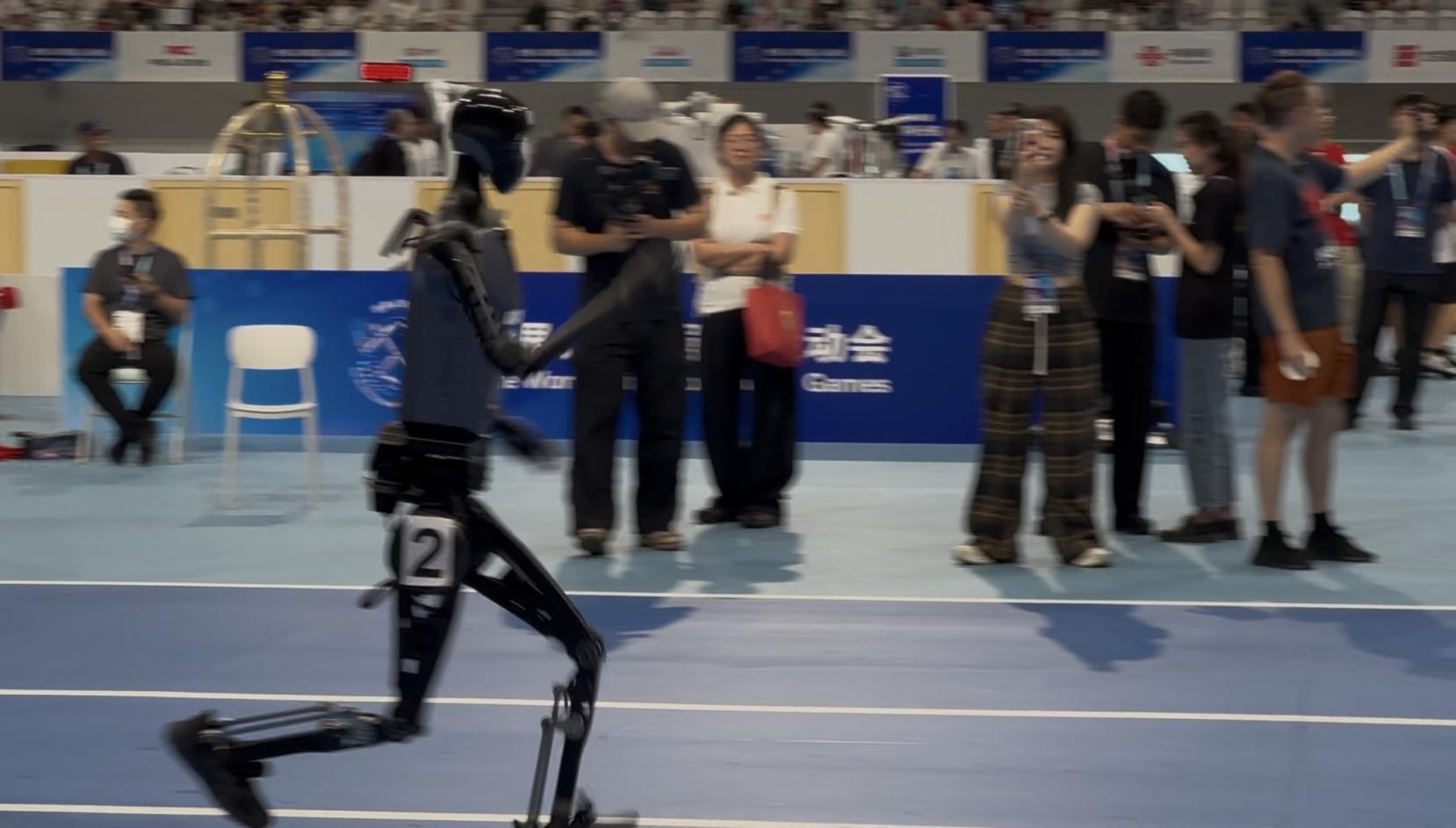北京联合大学学生组成的“有志青年”队派出了身高只有80多厘米的机器人,与同一组的一米八左右的“天工Ultra”站在一起堪称本届运动会的“最萌身高差”。